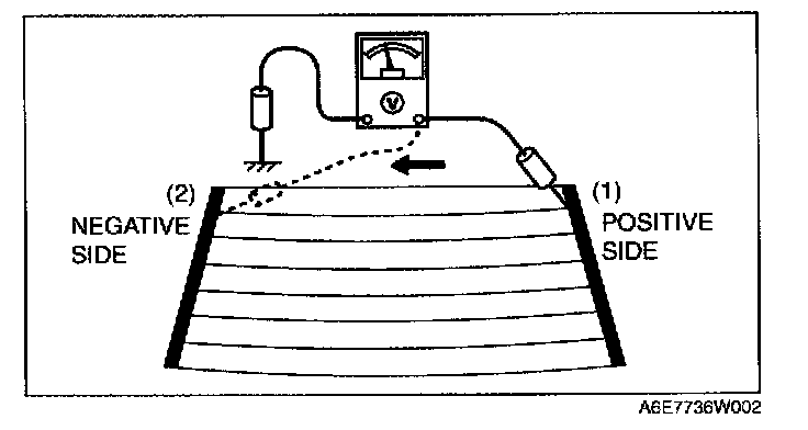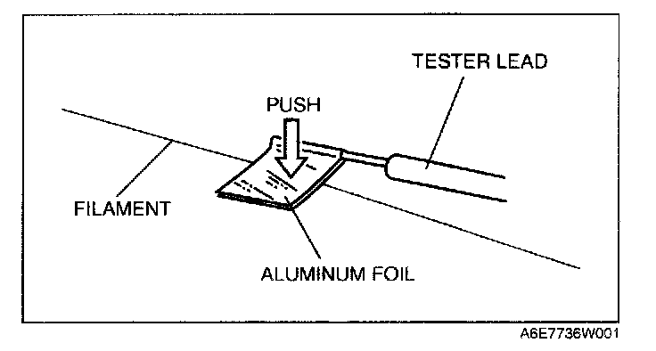 CAUTION: Directly touching the rear window defroster filament with the lead of the voltmeter could damage it. Wrap aluminum foil around the end of the lead and test the filament by touching it with the foil.
