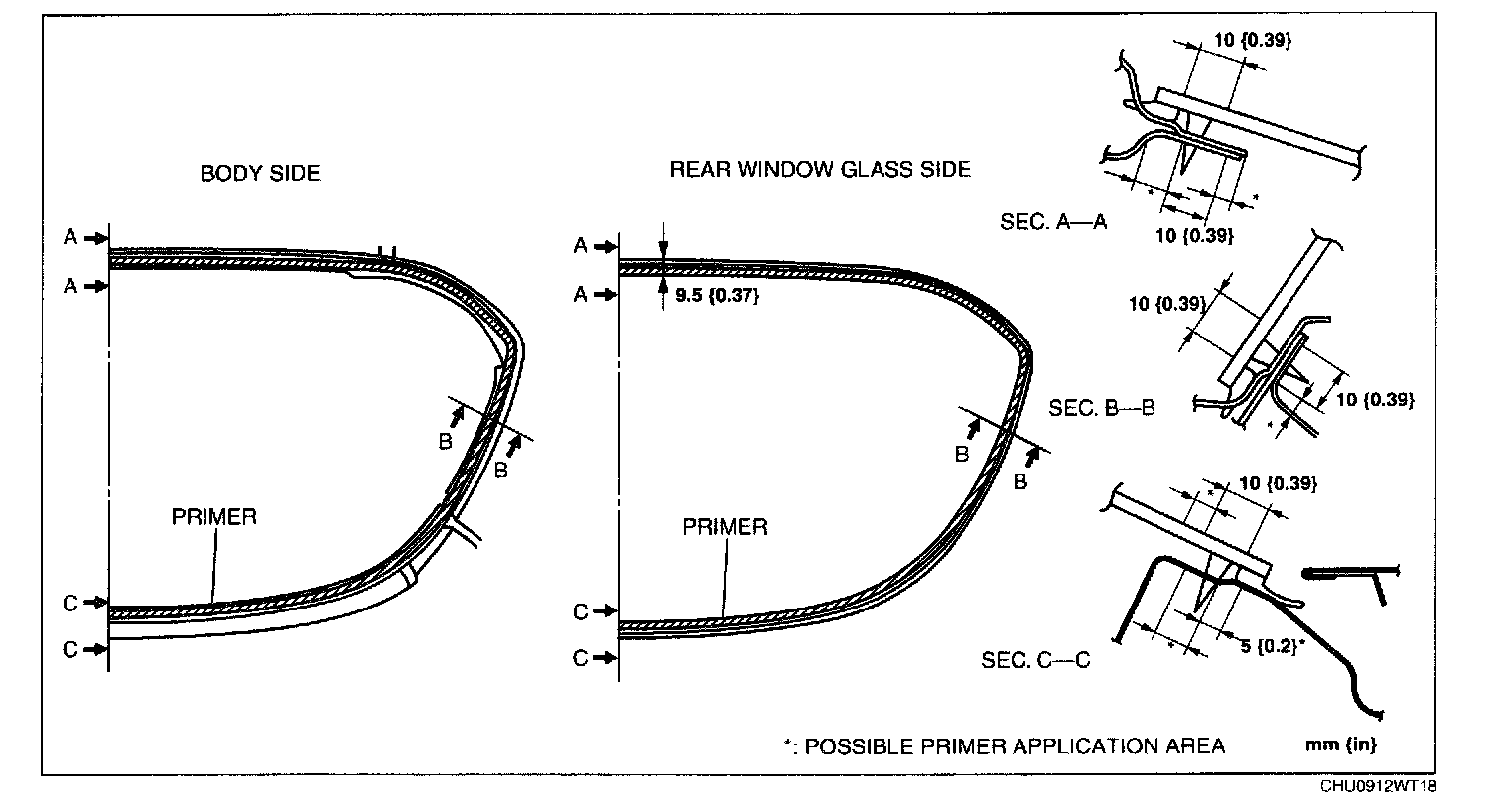 6. Use only glass primer on the rear window glass, and body primer on the rear window molding as shown in the figure. Allow it to dry for approx. 30 min.