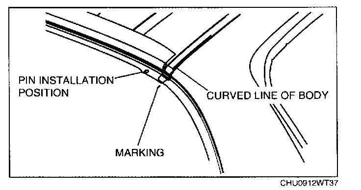 8. Position the marking on the rear window glass and the curved line of the body (roof molding) left and right so that they are aligned.