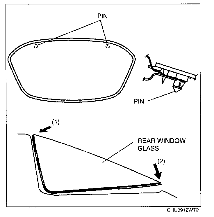 NOTE: If the rear window glass is tilted while inserting the pin into the body, the sealant will rub against the body flange, causing damage to the sealant. Do not tilt the rear window glass to the left or right while working.