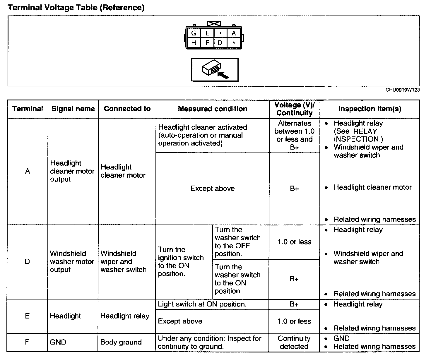 4. Verify that continuity at terminal F is as indicated in the Terminal Voltage Table (Reference).