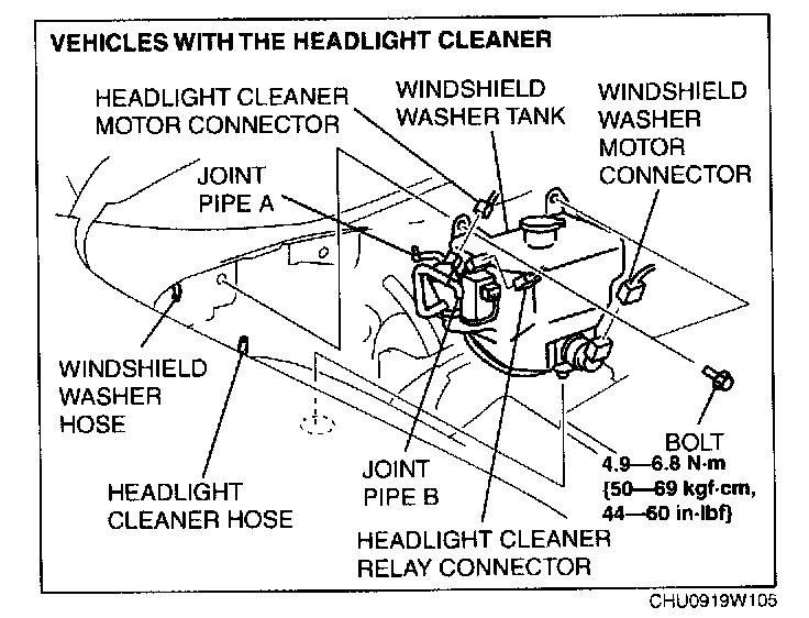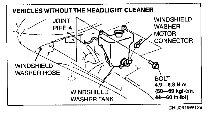 6. Disconnect the headlight cleaner hose from joint pipe B. (Vehicles with the headlight cleaner)