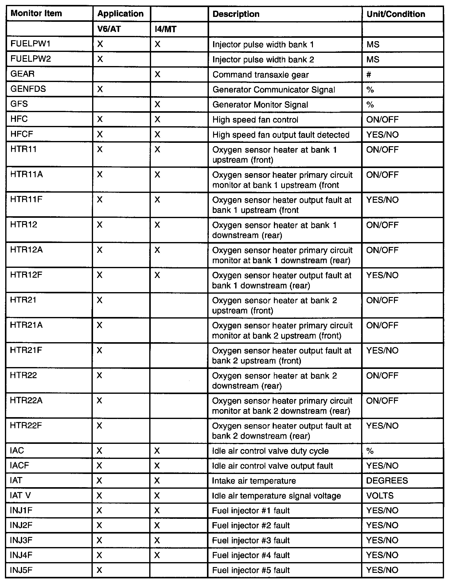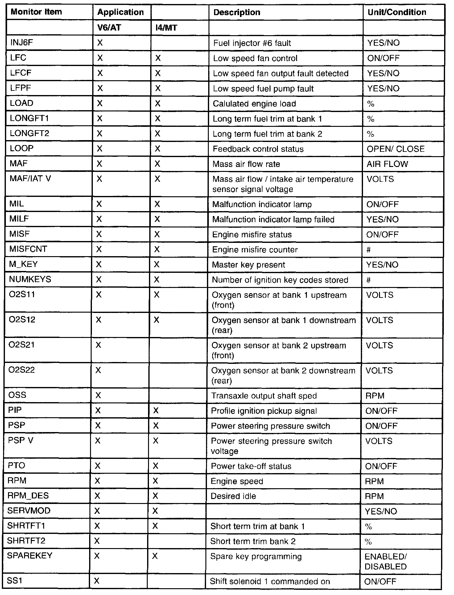 PID/Data Monitor Item Table Part 4: