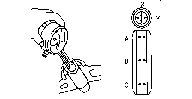 4. Measure the inner diameter of each valve guide in X and Y directions at the three points (A, B. and C) as indicated in the figure.