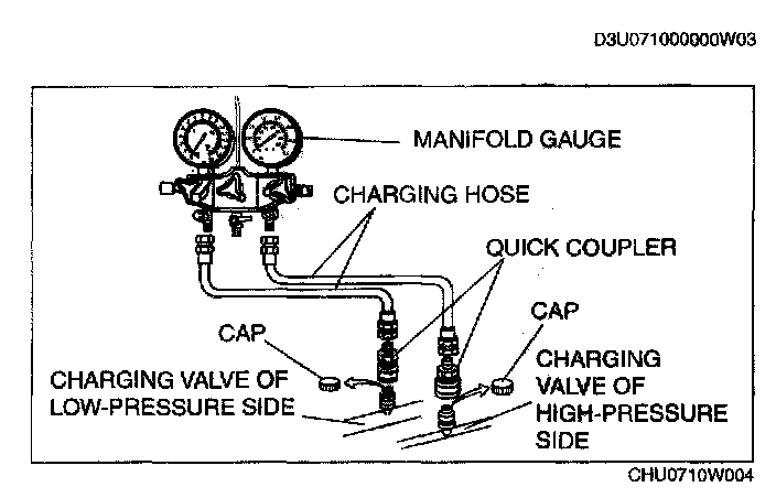 2. Connect the charging hoses to the high- and low-pressure side joints of the manifold gauge.