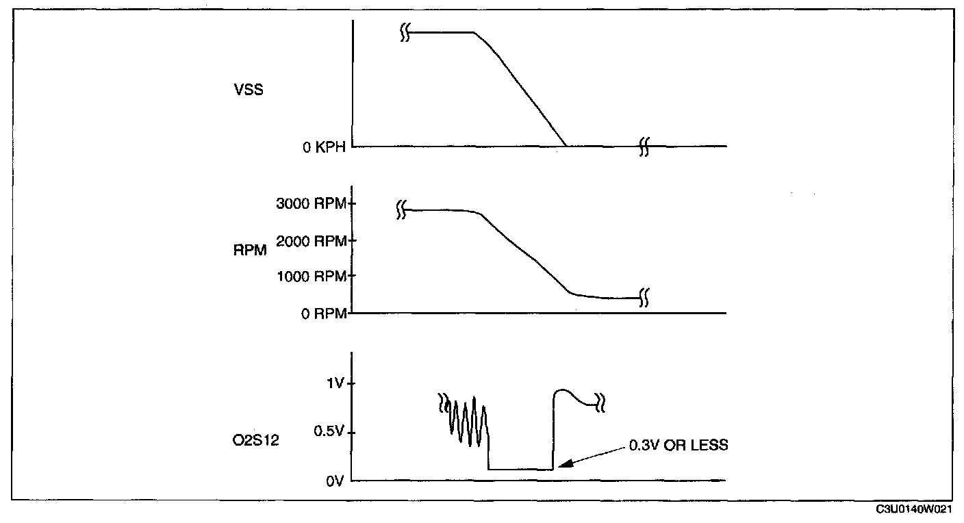 4. Verify that the middle HO2S outputs a voltage of 0.6 V or more, one time or more,, then verify that the middle HO2S voltage (PID: O2S12) is 0.3 V or less while decelerating as shown in the figure.