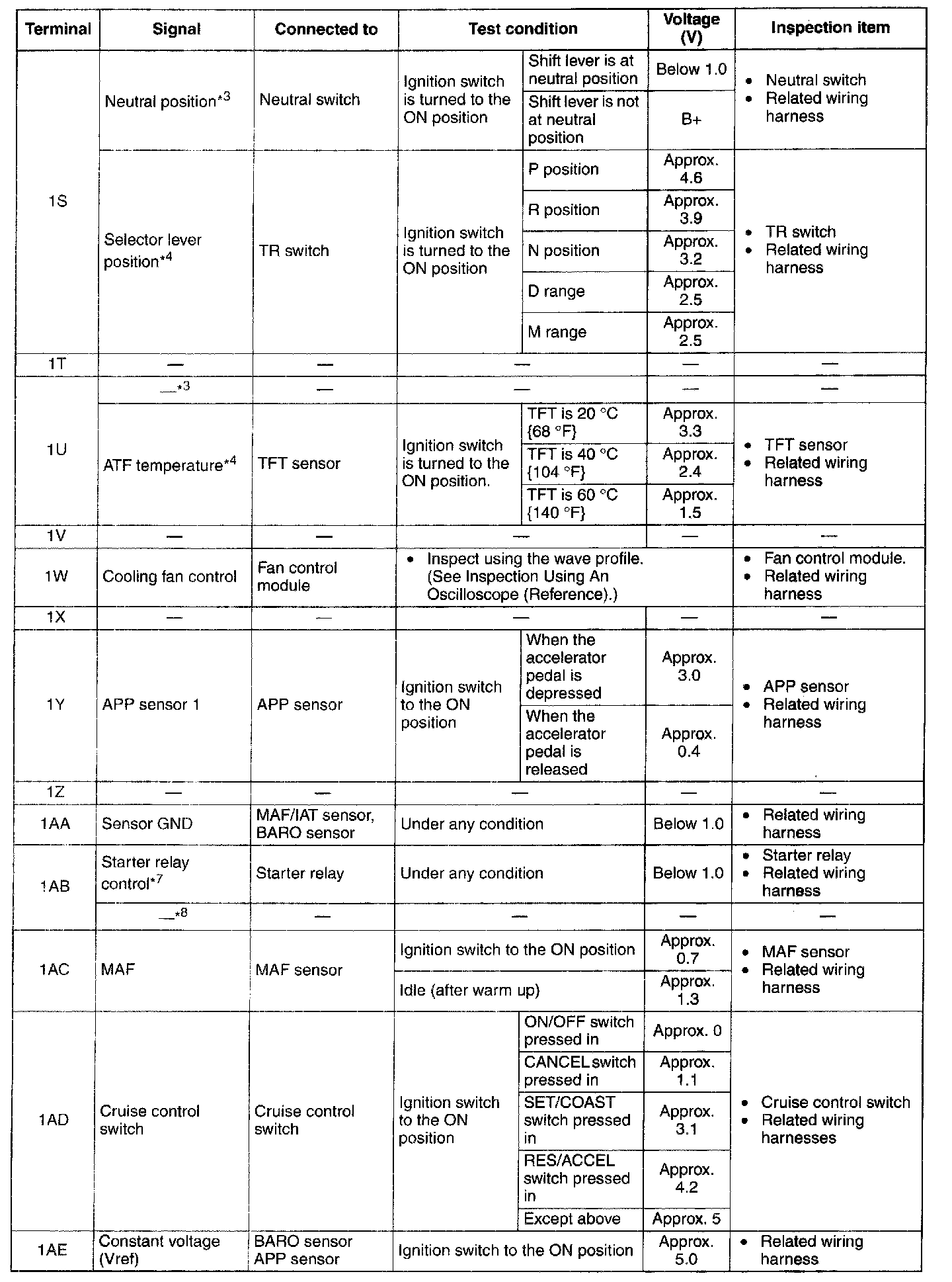 PCM Terminal Voltage Table (Reference) - Terminals (1S - 1AE):