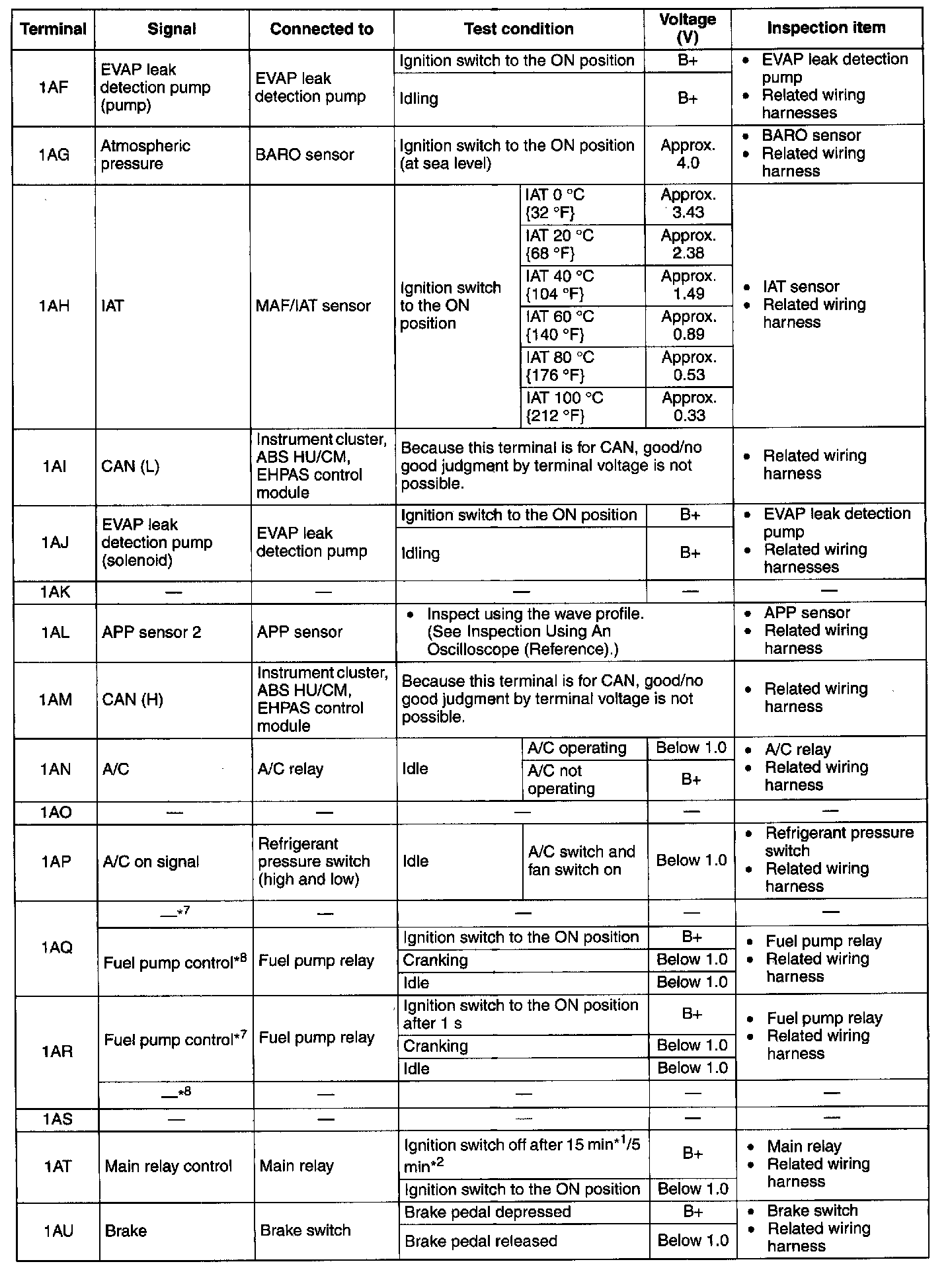 PCM Terminal Voltage Table (Reference) - Terminals (1A - AI):