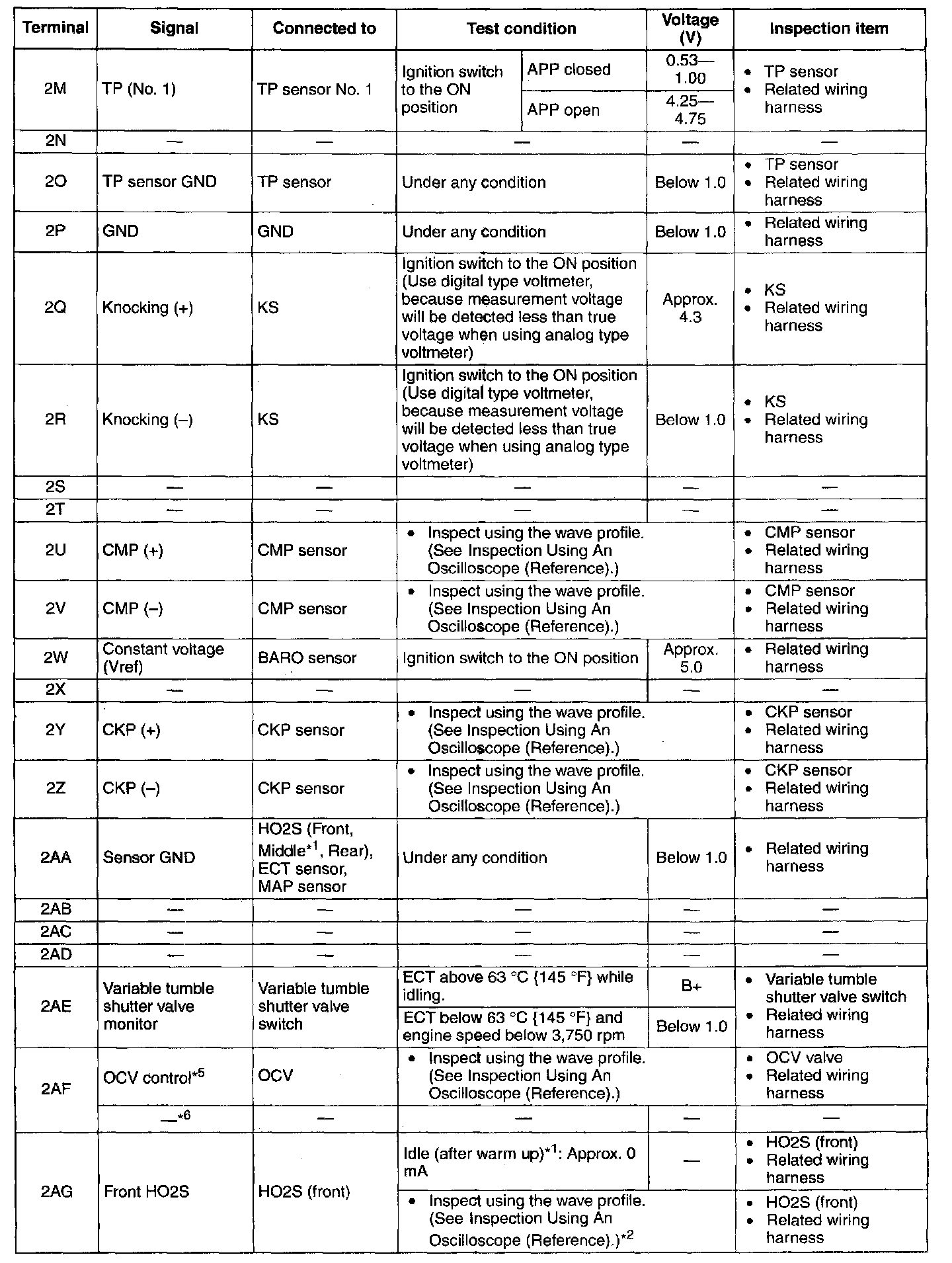 PCM Terminal Voltage Table (Reference) - Terminals (2M - 2AG):