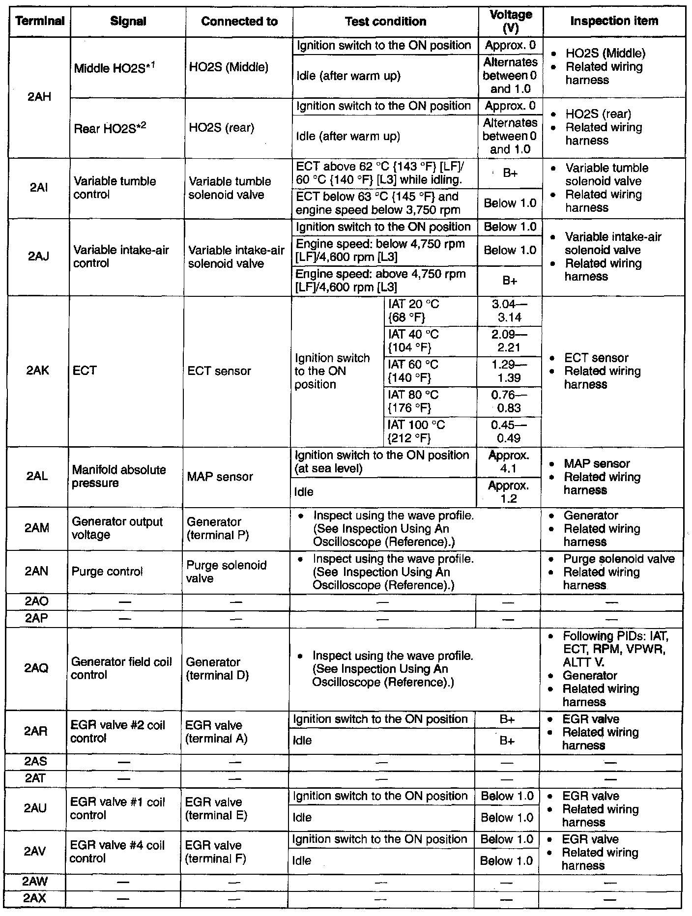 PCM Terminal Voltage Table (Reference) - Terminals (2AH - 2AX):
