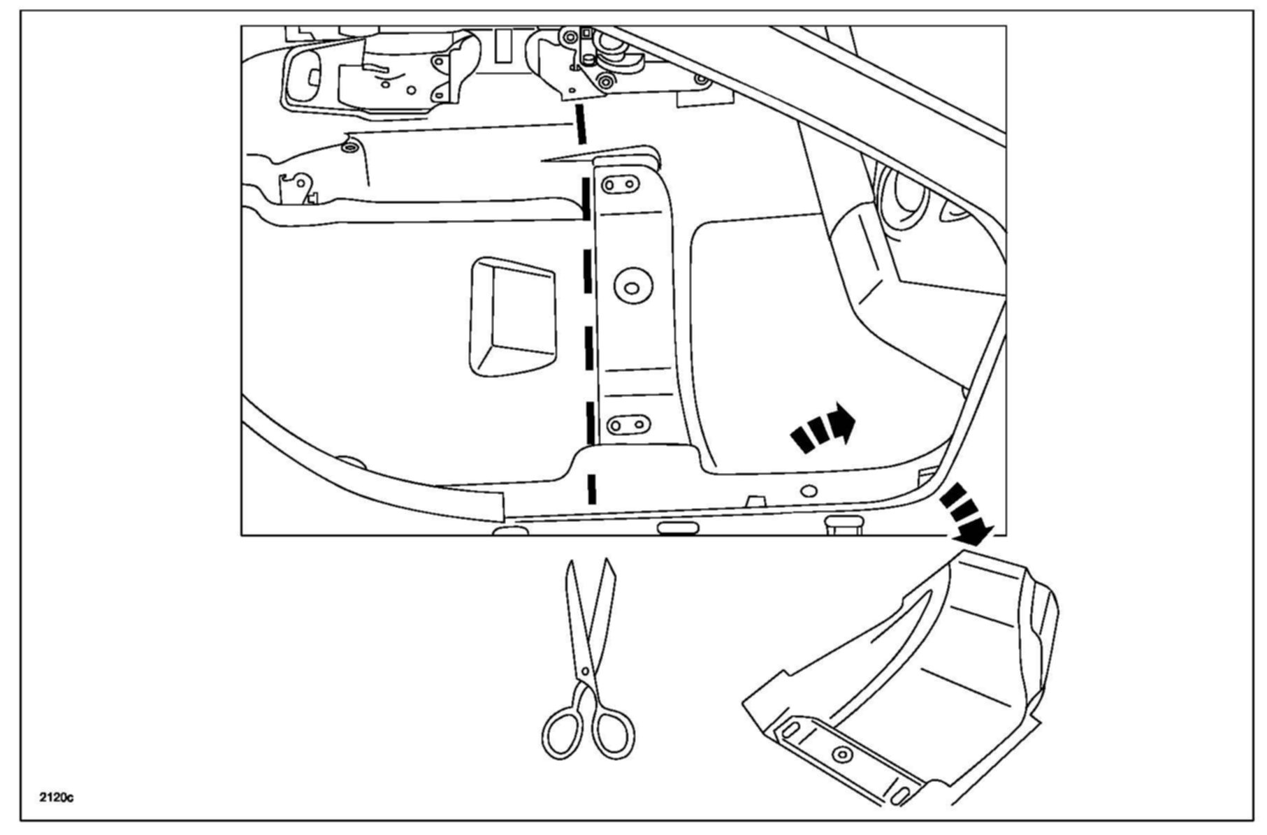 4. Cut the floor mat at the location where the No. 2 cross member is fitted, then remove the cut floor mat.