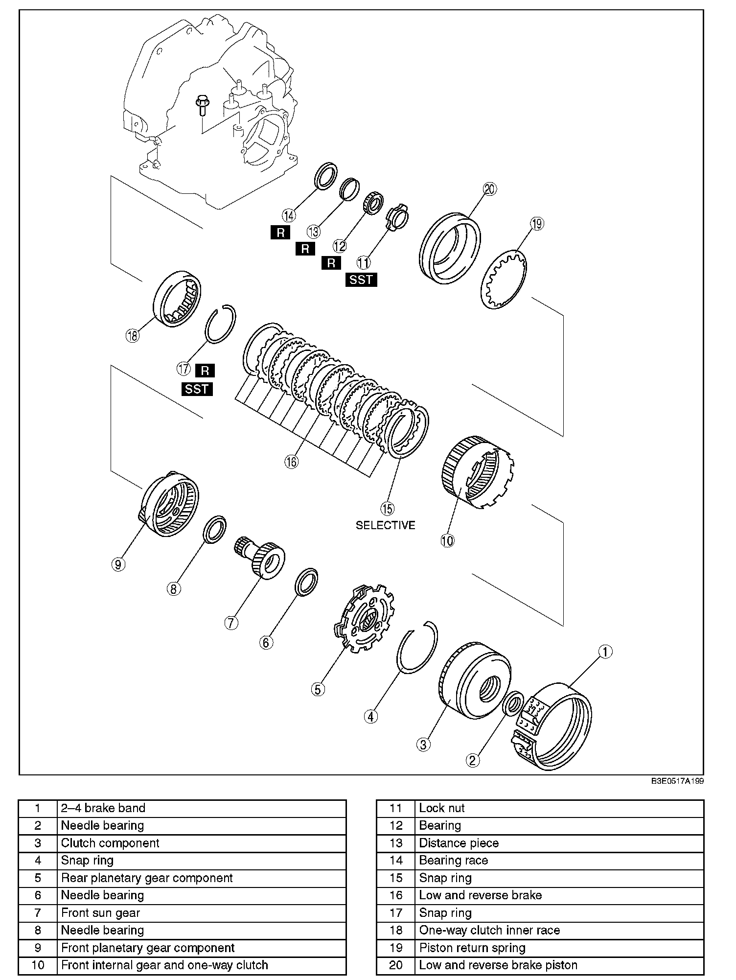 38. Remove the 2-4 brake band, and hold it together using a piece of wire as shown in the figure.