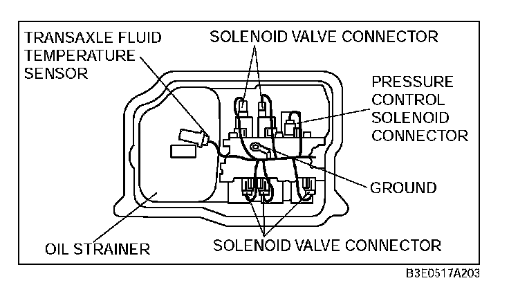 15. Disconnect the solenoid valve connector, ground, and transaxle fluid temperature sensor.