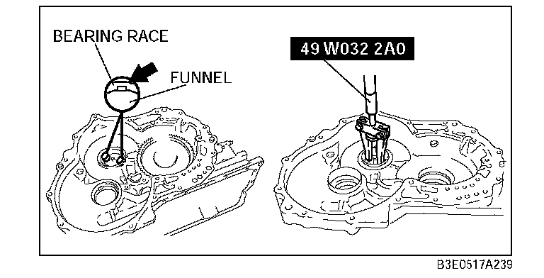 52. Tap the funnel at the areas indicated in the figure using a flathead screwdriver, etc. to make gaps big enough to install the SST. Then remove the bearing race.