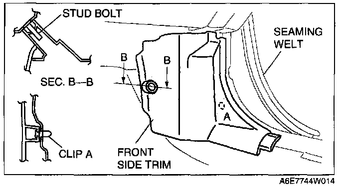 3. Pull the front side trim outward, disengage clip A and the stud bolt, then remove the front side trim.