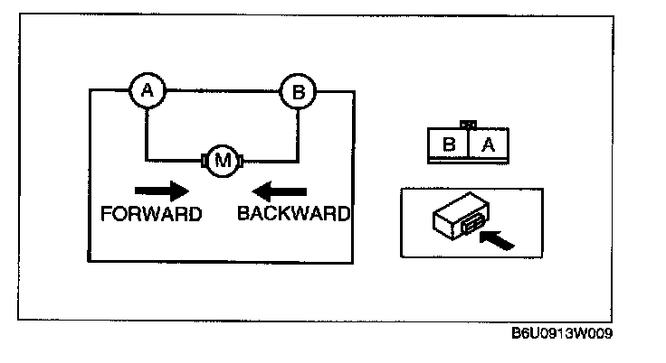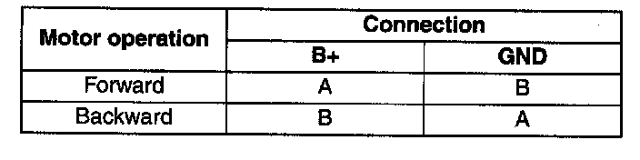 Apply battery positive voltage to the recliner motor terminals and inspect the recliner motor operation.