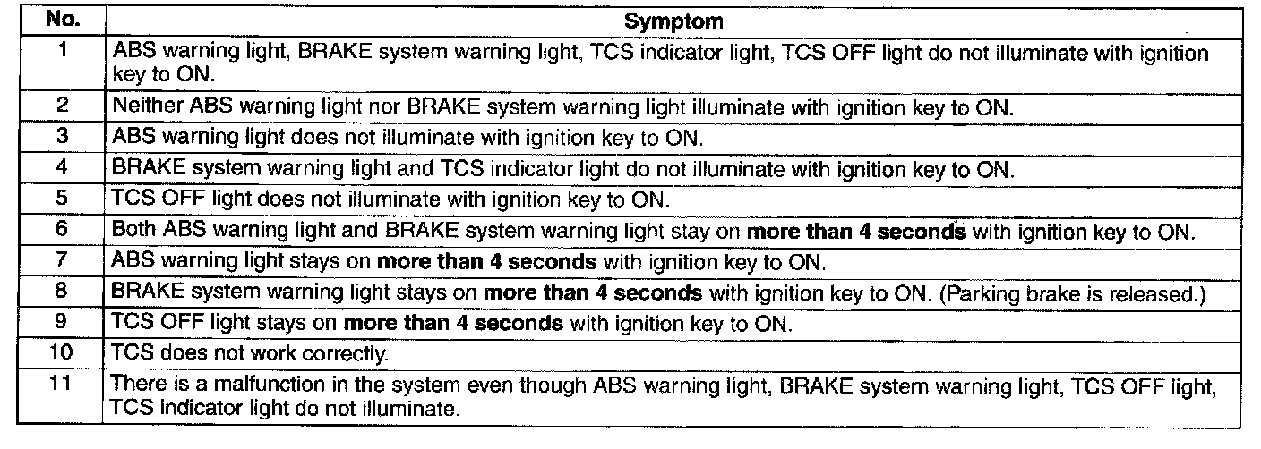 1. Any one or a combination of the ABS warning light, BRAKE system warning light, TCS indicator light, and TCS OFF light illuminate even when the system is normal.