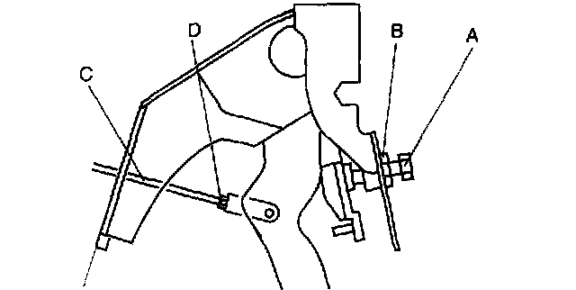2. Loosen locknut D and turn rod C to align the holes in the fork and in the pedal.