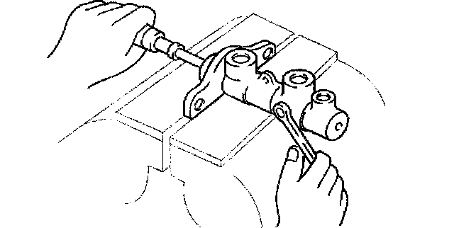 MASTER CYLINDER DISASSEMBLY/ASSEMBLYCaution: If the master cylinder body is damaged,. replace the unit as a component. When securing the master cylinder in a vise, tighten only the flange of the master cylinder.