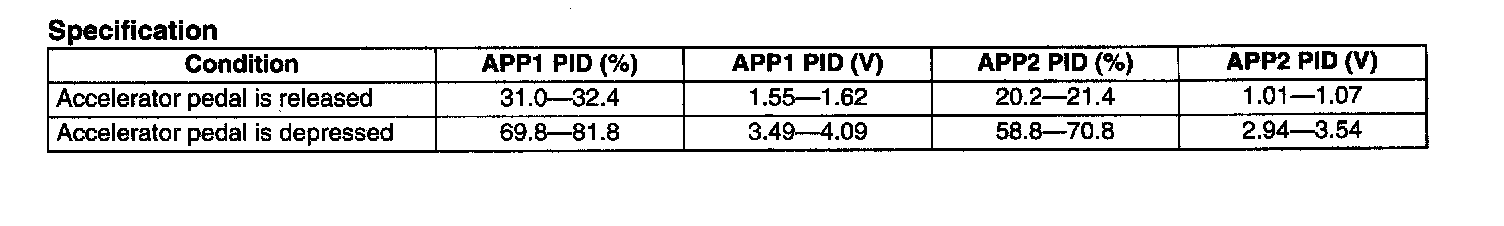 5. Verify that the APP1 or APP2 PID (percentage) is as indicated in the table according to the condition of the accelerator pedal.