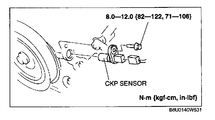 CRANKSHAFT POSITION (CKP) SENSOR REMOVAL/INSTALLATIONCAUTION: Do not forcefully pull the wiring harness of the CKP sensor. Doing so will break the harness.