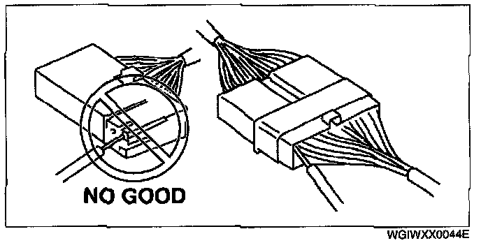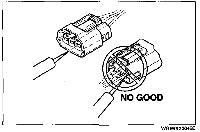 - When a tester is used to inspect for continuity or measuring voltage, insert the tester probe from the wiring harness side.