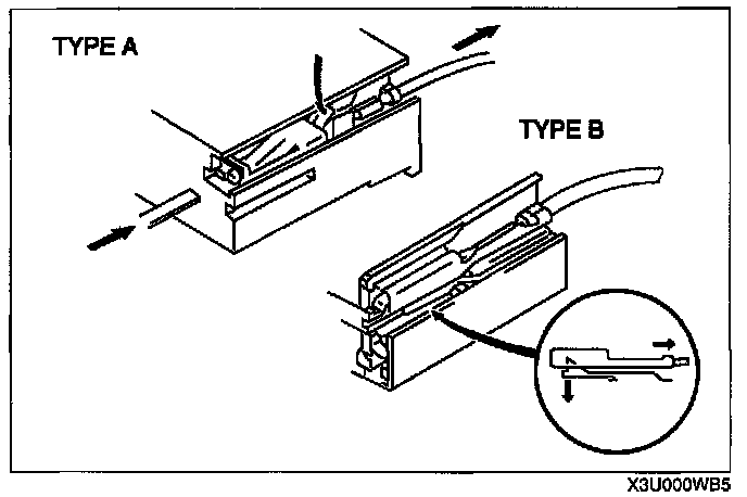 - Use the appropriate tools to remove a terminal as shown. When installing a terminal, be sure to insert it until it locks securely.