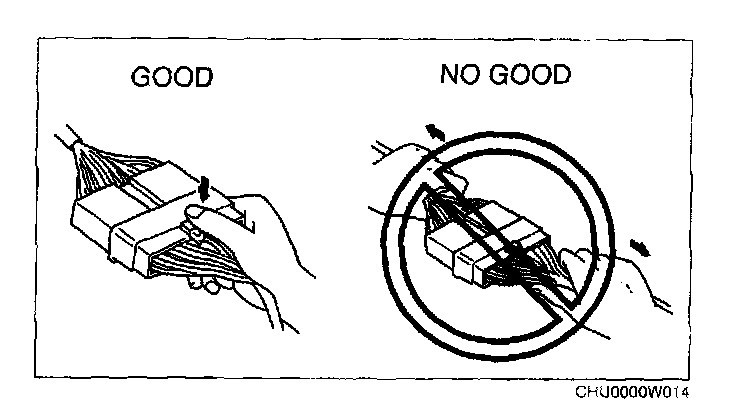 - When a tester is used to inspect for continuity or measuring voltage, insert the tester probe from the wiring harness side.