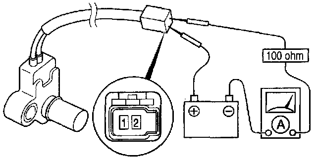 12. Connect the input/turbine speed sensor terminal 2 to the battery positive terminal, connect the battery negative terminal to input/turbine speed sensor terminal 1 through an ammeter set to a resistance of 100 ohm.