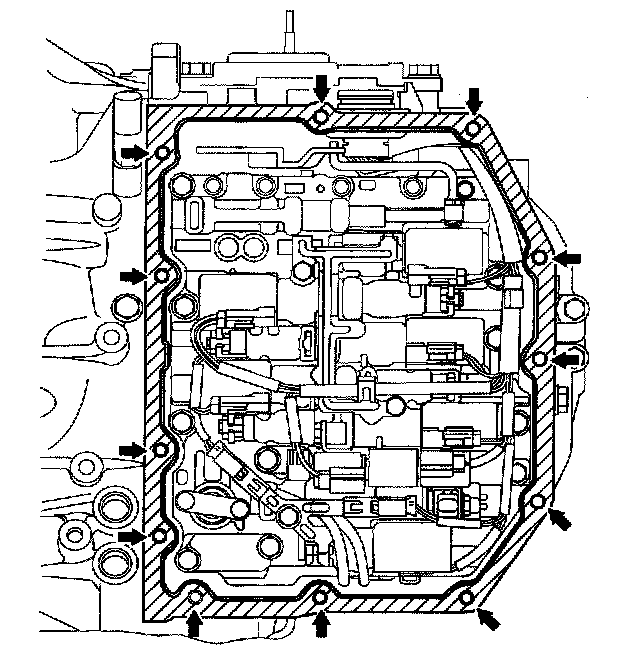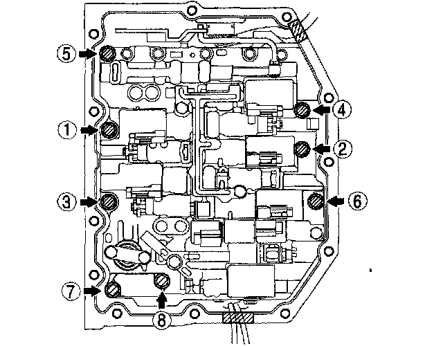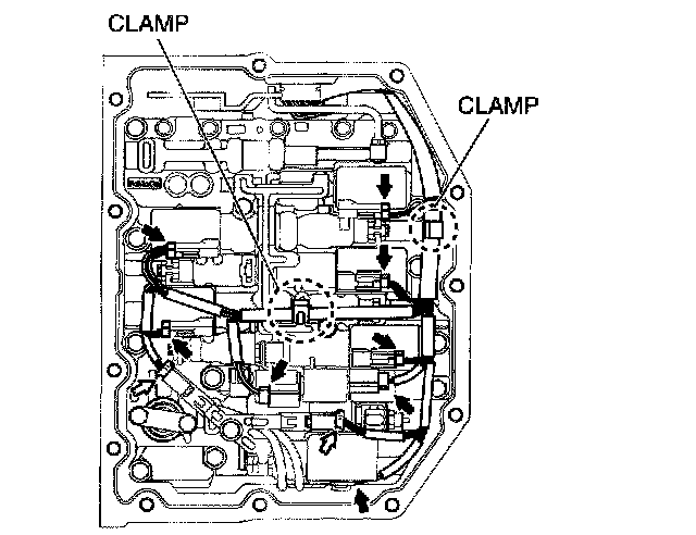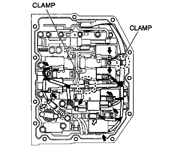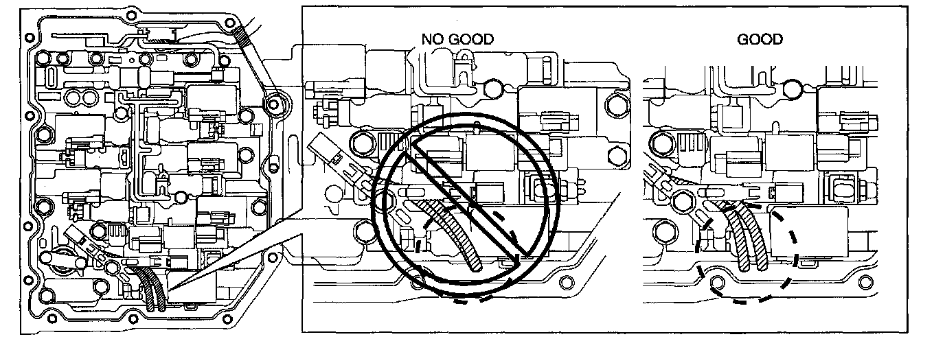 ^ If the control valve body cover is installed with the wiring harnesses overlapped, the wiring harnesses may be pinched between the cover and valve body causing the wiring harnesses to be damaged. Therefore, verify that the wiring harnesses are not overlapped when installing the control valve body cover.