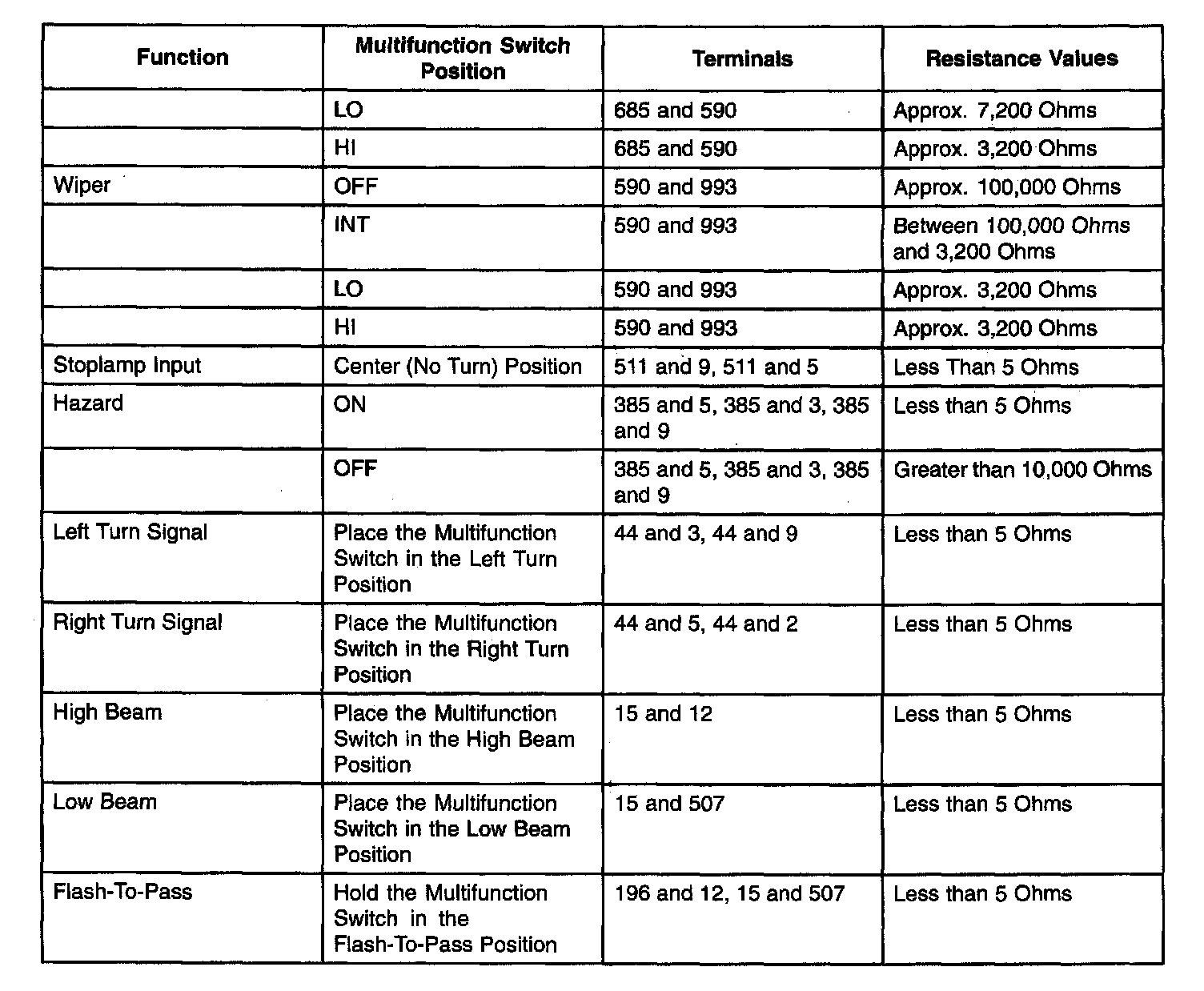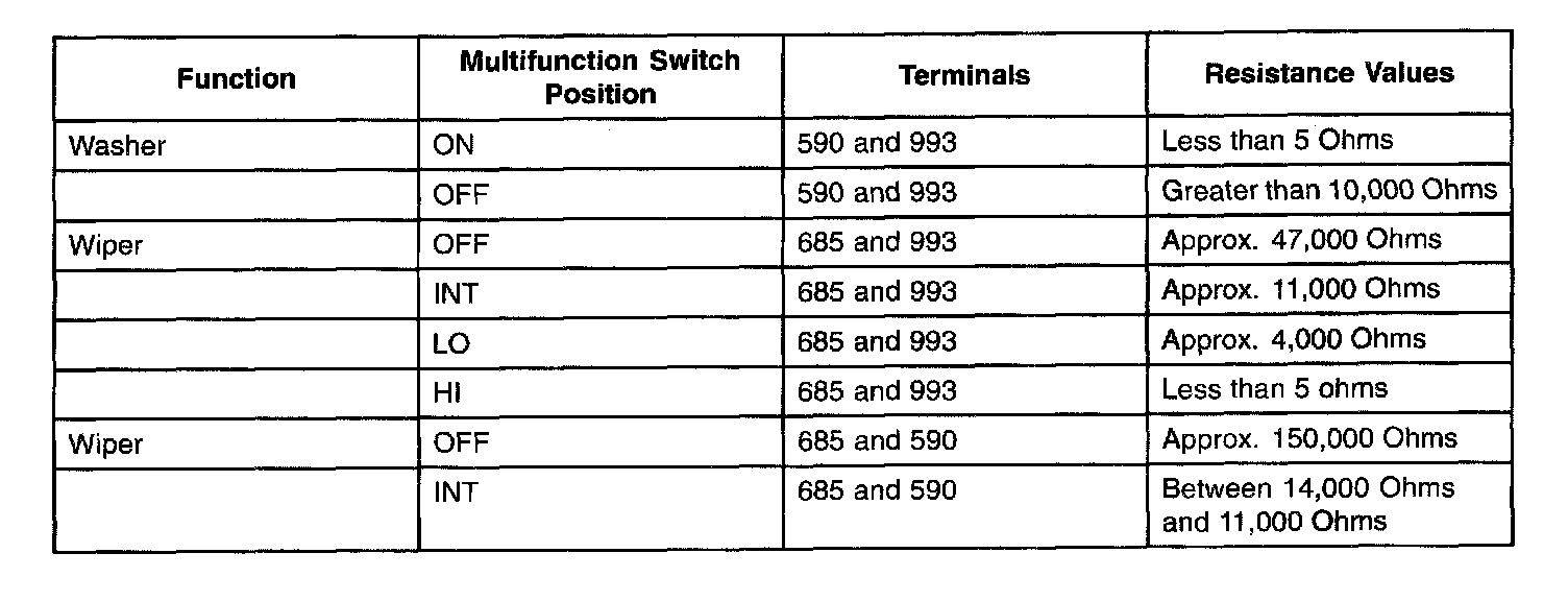 If the resistances are as specified, the multifunction switch is OK. Return the multifunction switch to the vehicle. Test the system for normal operation. If the resistances are not as specified, Replace the multifunction switch. Test the system for normal operation.