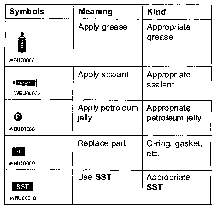 , sealant and SST use. These symbols show application points or use of these materials during service.