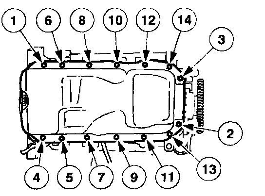 Stage 2: Starting from the rear of the oil pan, tighten the fasteners to 12 Nm (1.2 kgf-cm (9 ft. lbs.).