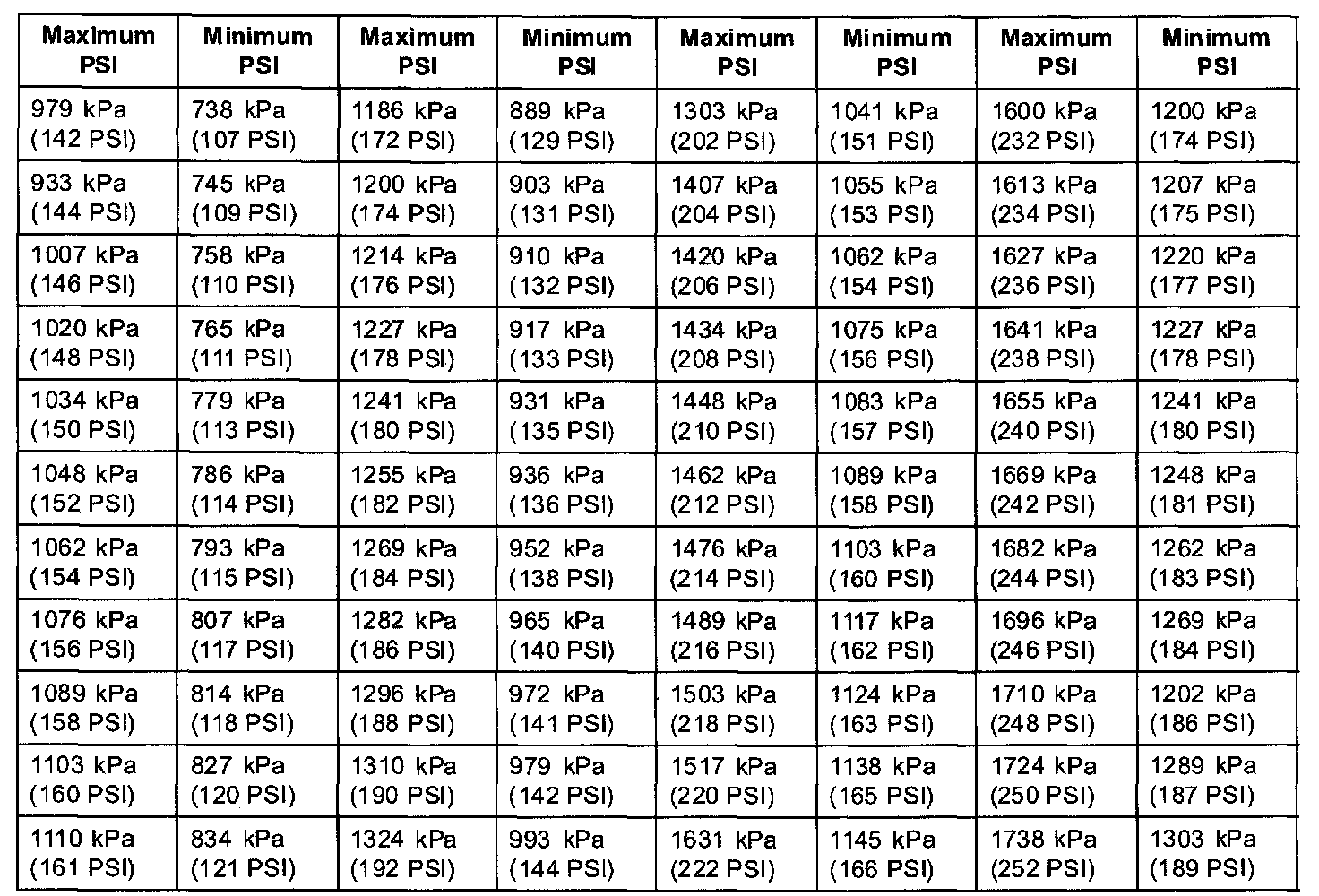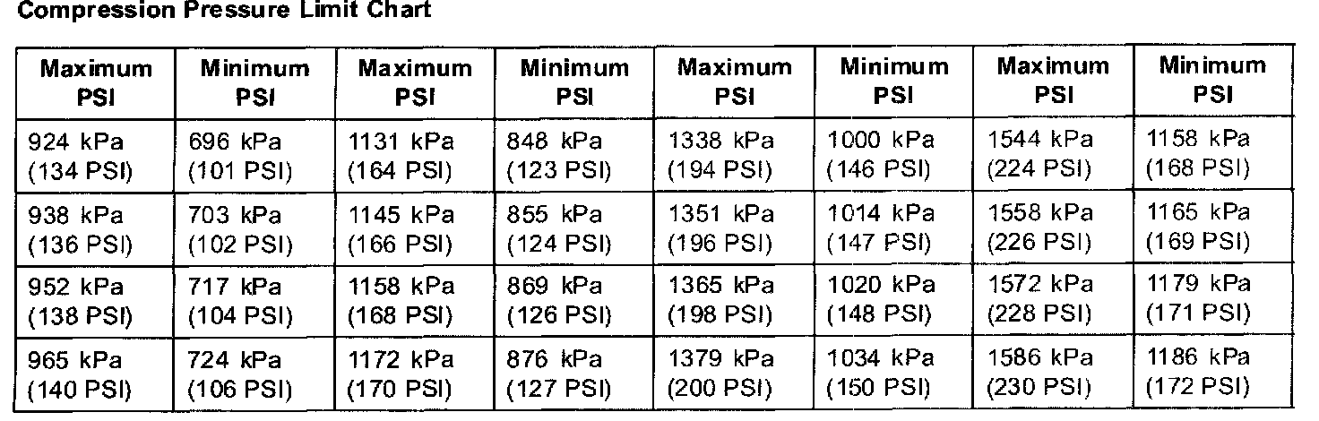 Compression Test - ResultsThe indicated compression pressures are considered within specification if the lowest reading cylinder is at least 75 percent of the highest reading. The following Compression Pressure Limit Chart shows acceptable pressure ranges. Use the highest compression reading obtained from the compression test and verify that the lowest compression reading is within the range shown in the chart. See the Compression Pressure Limit Chart.