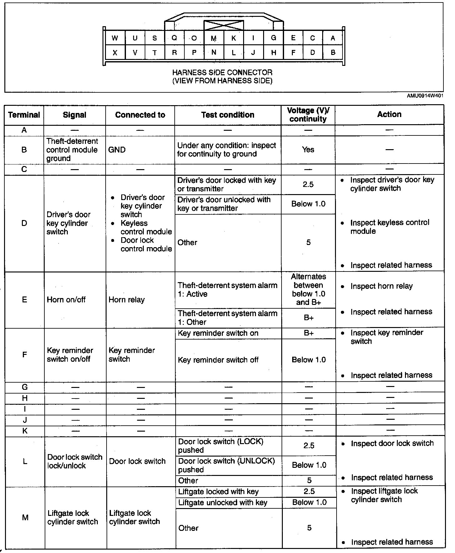 3. Disconnect the theft-deterrent control module connector before inspecting for continuity at terminals B, N, O, P, and T.