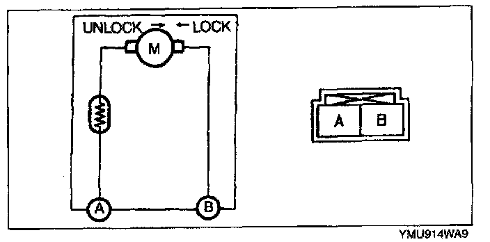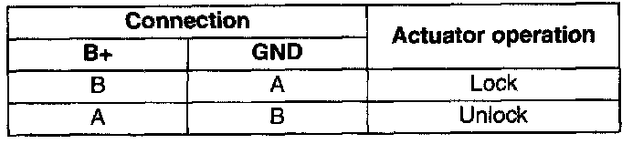 2. Apply battery positive voltage to the liftgate lock actuator terminals and inspect the operation of the liftgate lock actuator.