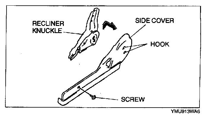 2. Lift the side cover up in the direction shown by the arrow, then unhook it from the recliner knuckle.