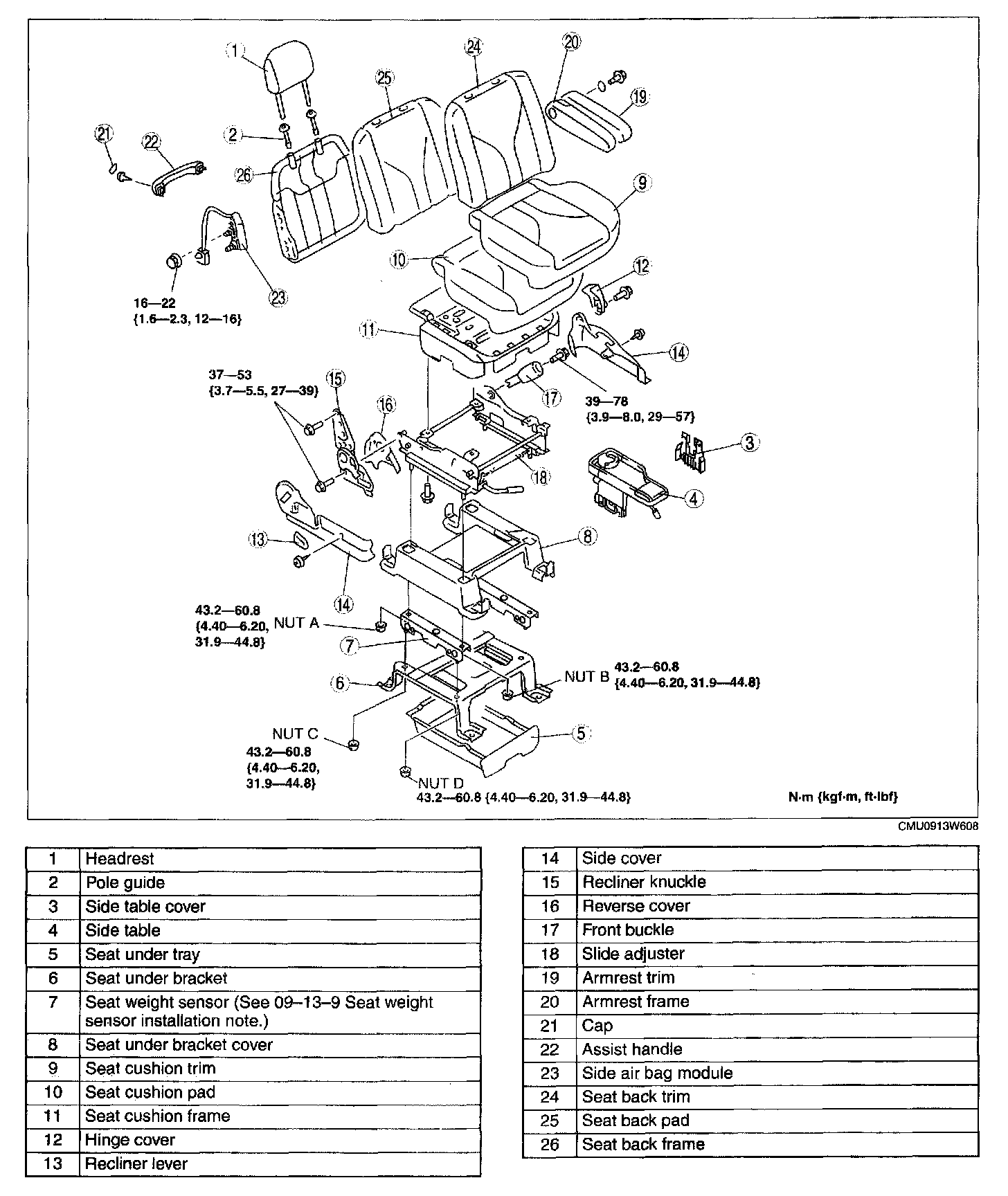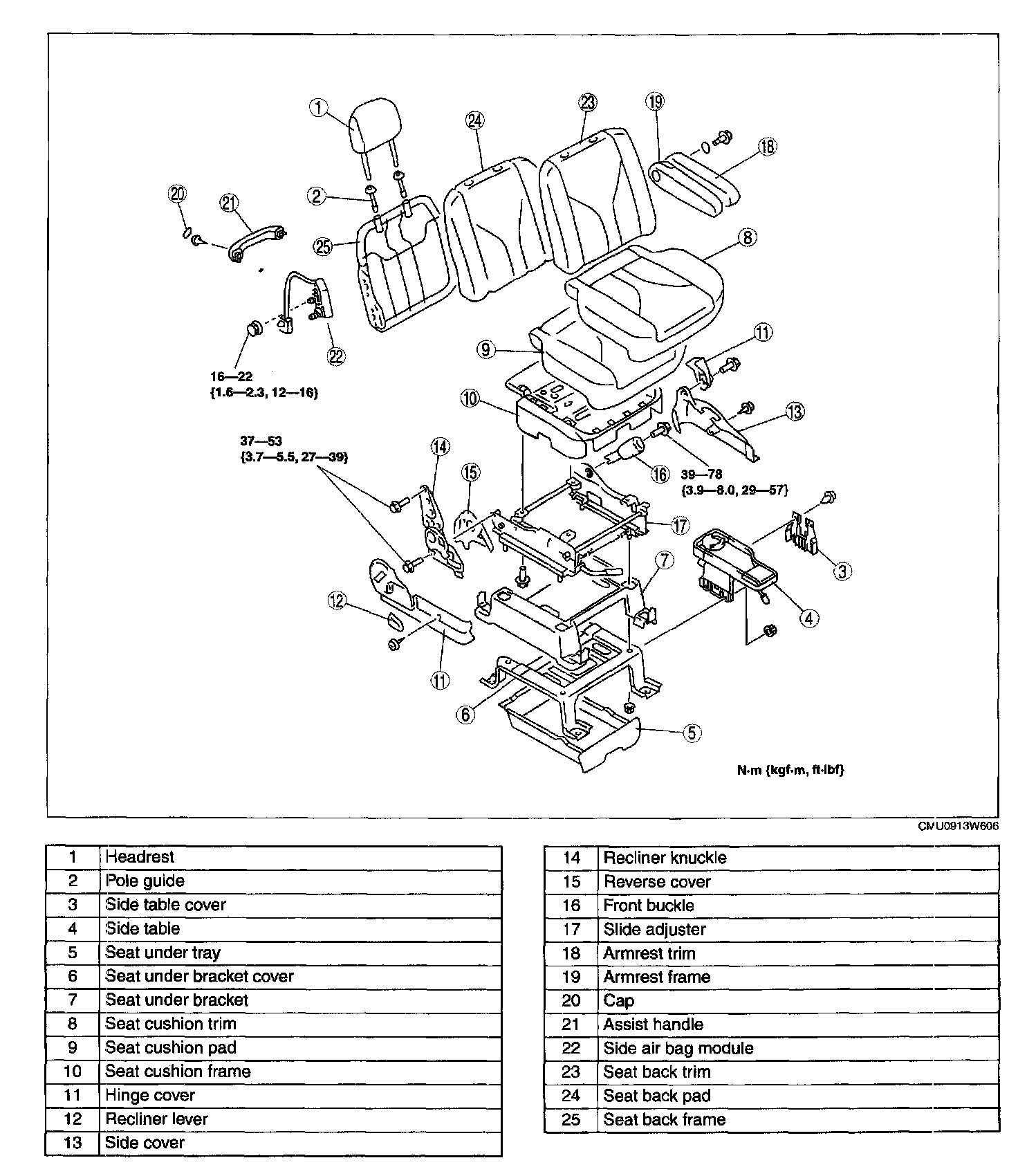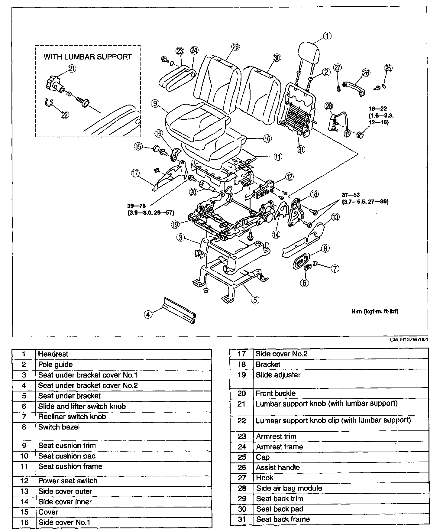 FRONT SEAT DISASSEMBLY/ASSEMBLYWARNING: Handling the front seat (side air bag, seat weight sensor) improperly can accidentally deploy the side air bag, which may seriously injure you. Read the service warnings and cautions before handling the air bag module.