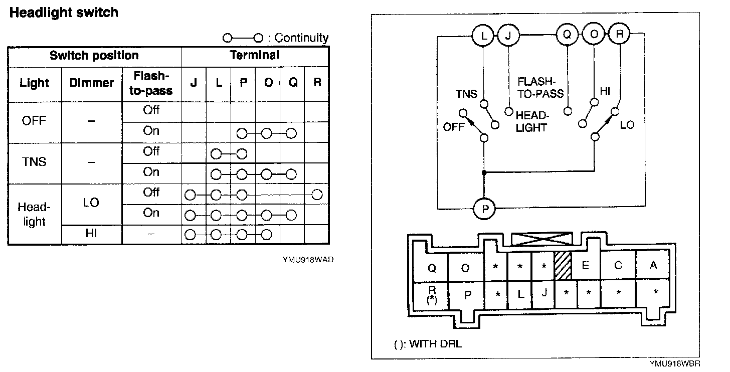 2. Inspect for continuity between the light switch terminals using an ohmmeter.