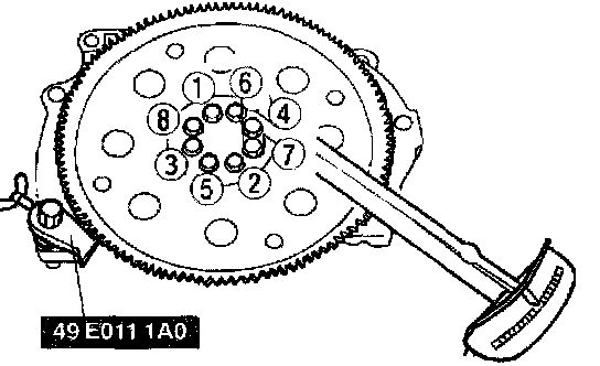 2. Tighten the drive plate mounting bolts in two or three steps in the order shown.
