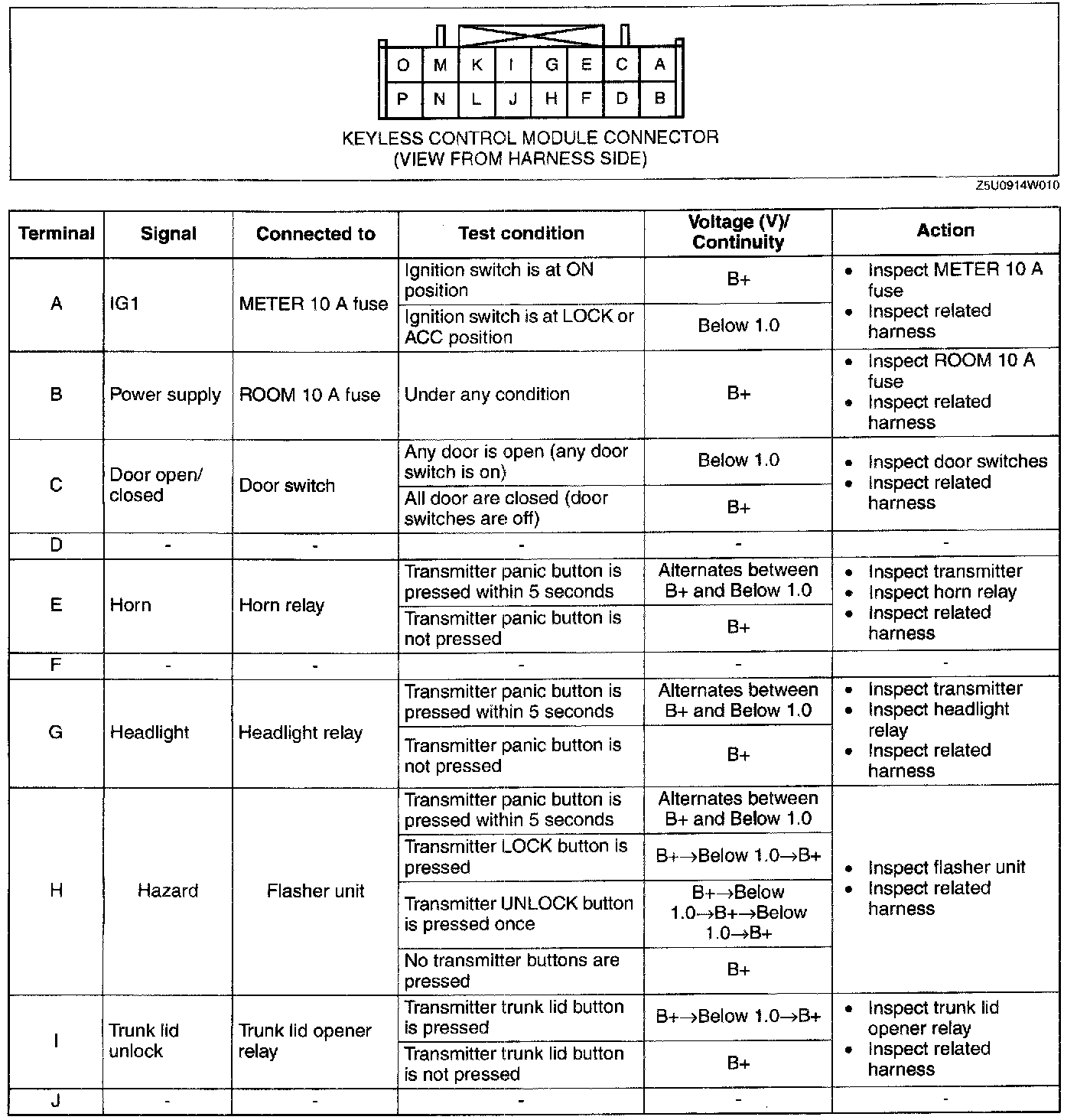 2. Measure the voltage at the keyless control module terminals (other than terminal L) as indicated.
