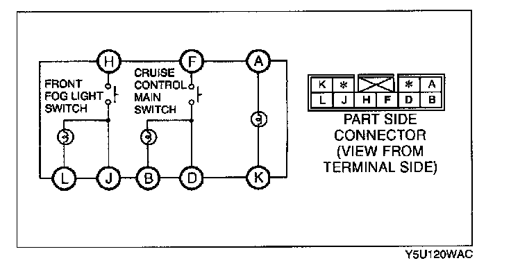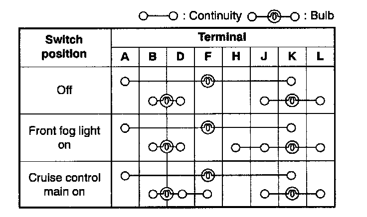 Inspect for continuity between the cruise control main switch terminals using an ohmmeter.