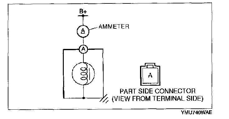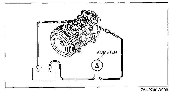 2. Connect battery positive voltage and an ammeter to terminal A of the magnetic clutch and ground to A/C compressor body as shown.