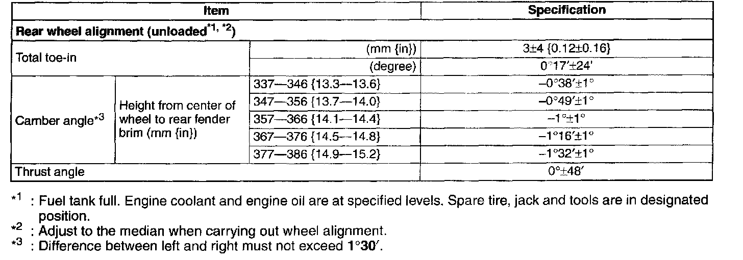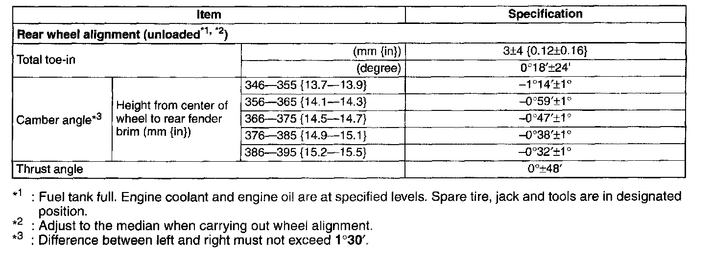 ^ Turning the front cam one graduation changes the camber about 13° and the toe-in about 2.3 mm (0.1 inch). Turning the rear cam one graduation changes the camber about 8° and the toe-in about 2.3 mm (0.1 inch).