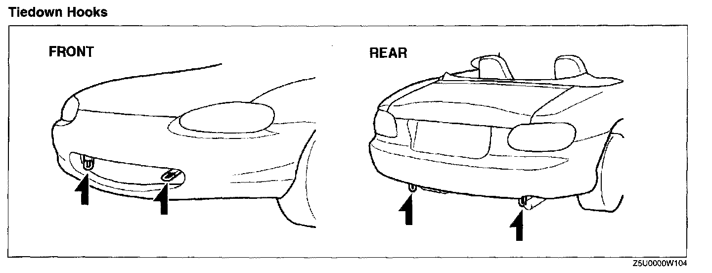 Caution: Do not use the hook loops under the front and rear for towing. They are designed ONLY for tying down the vehicle when it is being transported. Using them for towing will damage the bumper.