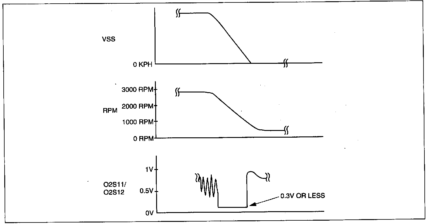 4. Verify that the front/rear HO2Soutputs a voltage of 0.6 V or more, one time or more, then verify that the front/rear HO2S voltage (PID: O2S11/O2S12) is 0.3 V or less while decelerating as shown in the figure.