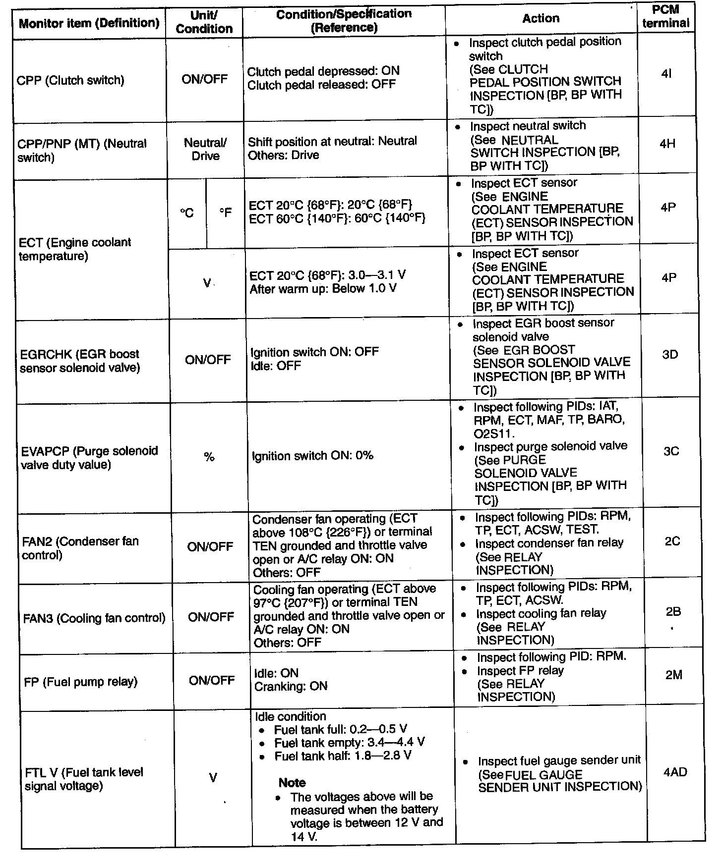 - Camshaft position sensor. (See CAMSHAFT POSITION (CMP) SENSOR INSPECTION [BP, BP WITH TC].)