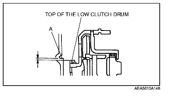 10. Verify that the top of the low clutch drum is lower than surface A (receiving surface of the 2-4 brake plate) of the transmission case.