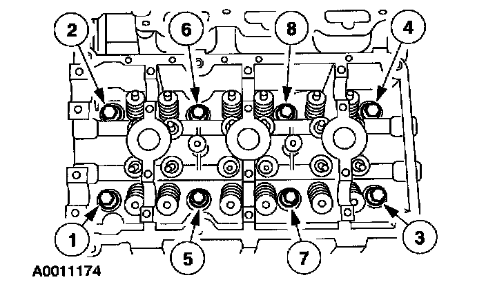 50. Loosen the LH and RH camshaft cap bolts in the indicated sequence and remove the camshaft caps.