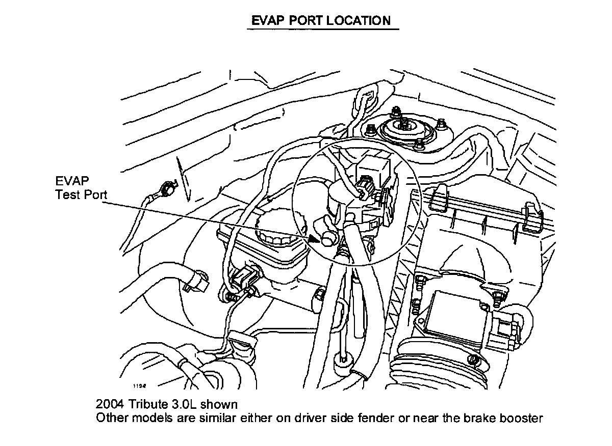 ^ 2001-2002 Tribute in the engine compartment near left front shock tower